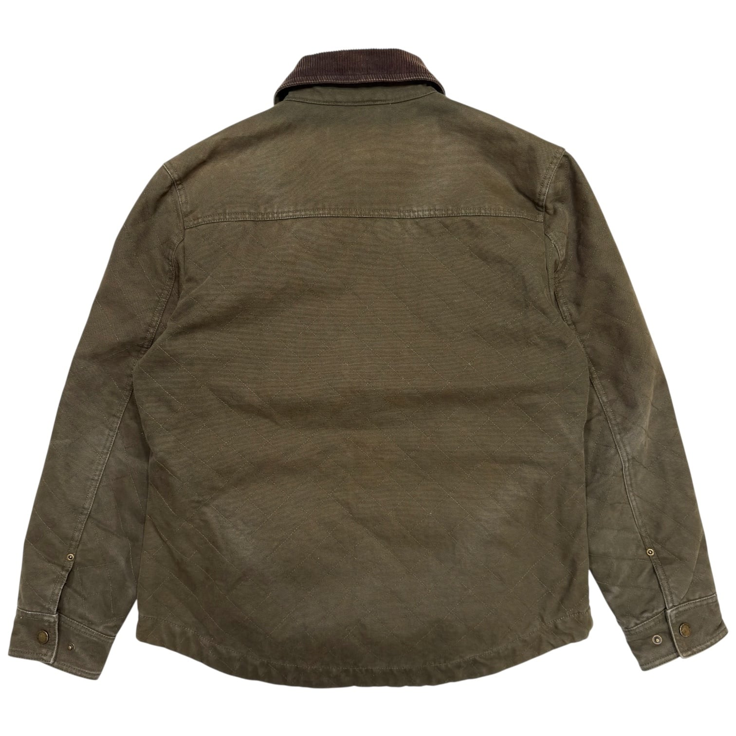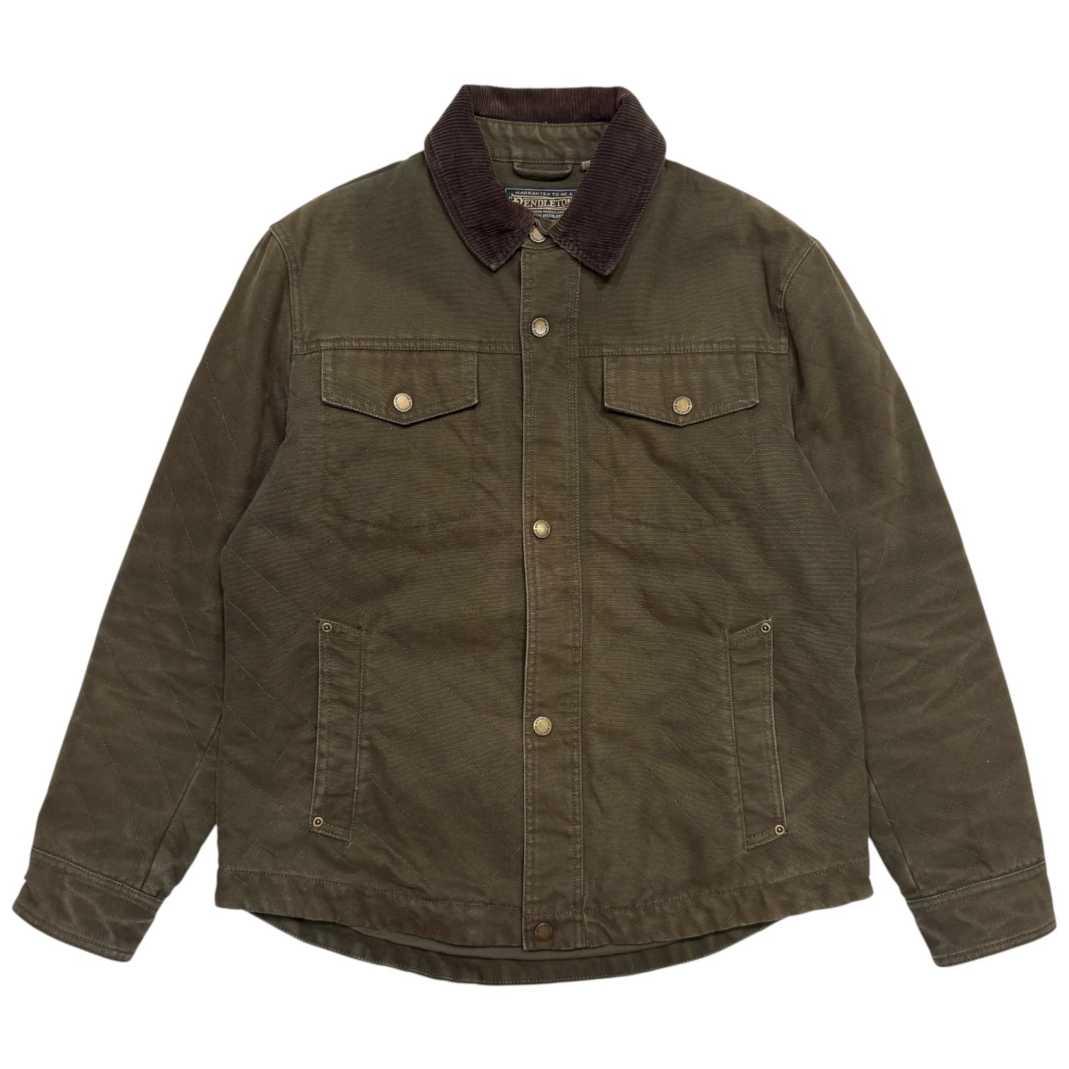 タフなオリーブカーキ系のコットン生地全体にダイヤモンドキルティングが施されており、王道のアメカジ・ワークスタイルな襟のブラウンコーデュロイとの切り替え。フロントはスナップボタン仕様で着脱も容易です。