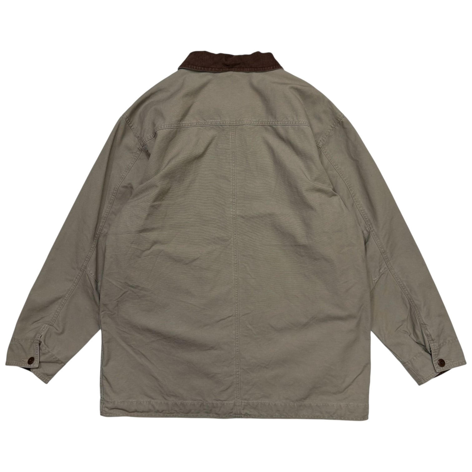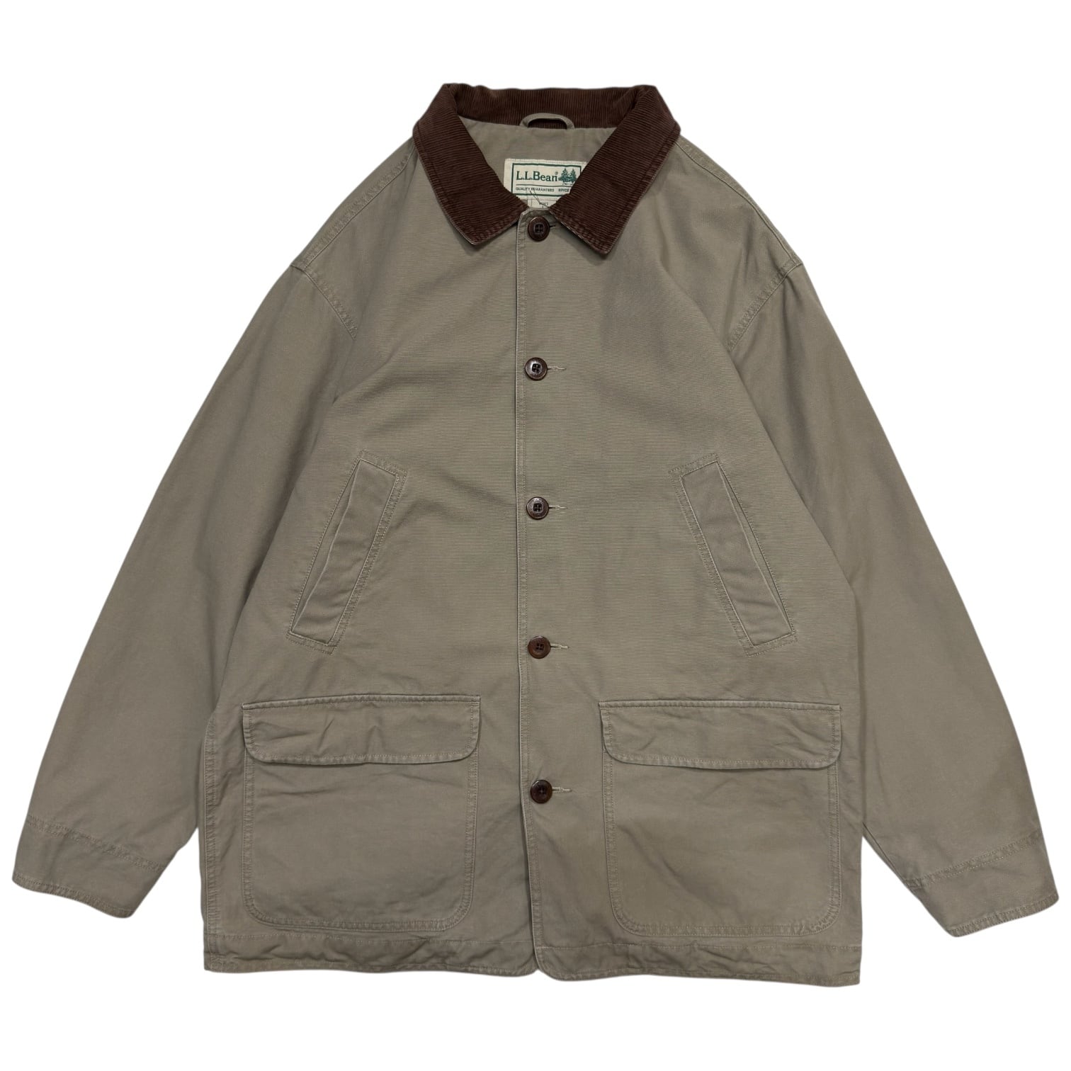 タフで肉厚なベージュのコットンキャンバス生地に、ブラウンのコーデュロイ襟を合わせた王道のカラーリング。フロントにはハンドウォーマーポケットと、フラップ付きの大型ポケットが配置された完成されたデザインです。