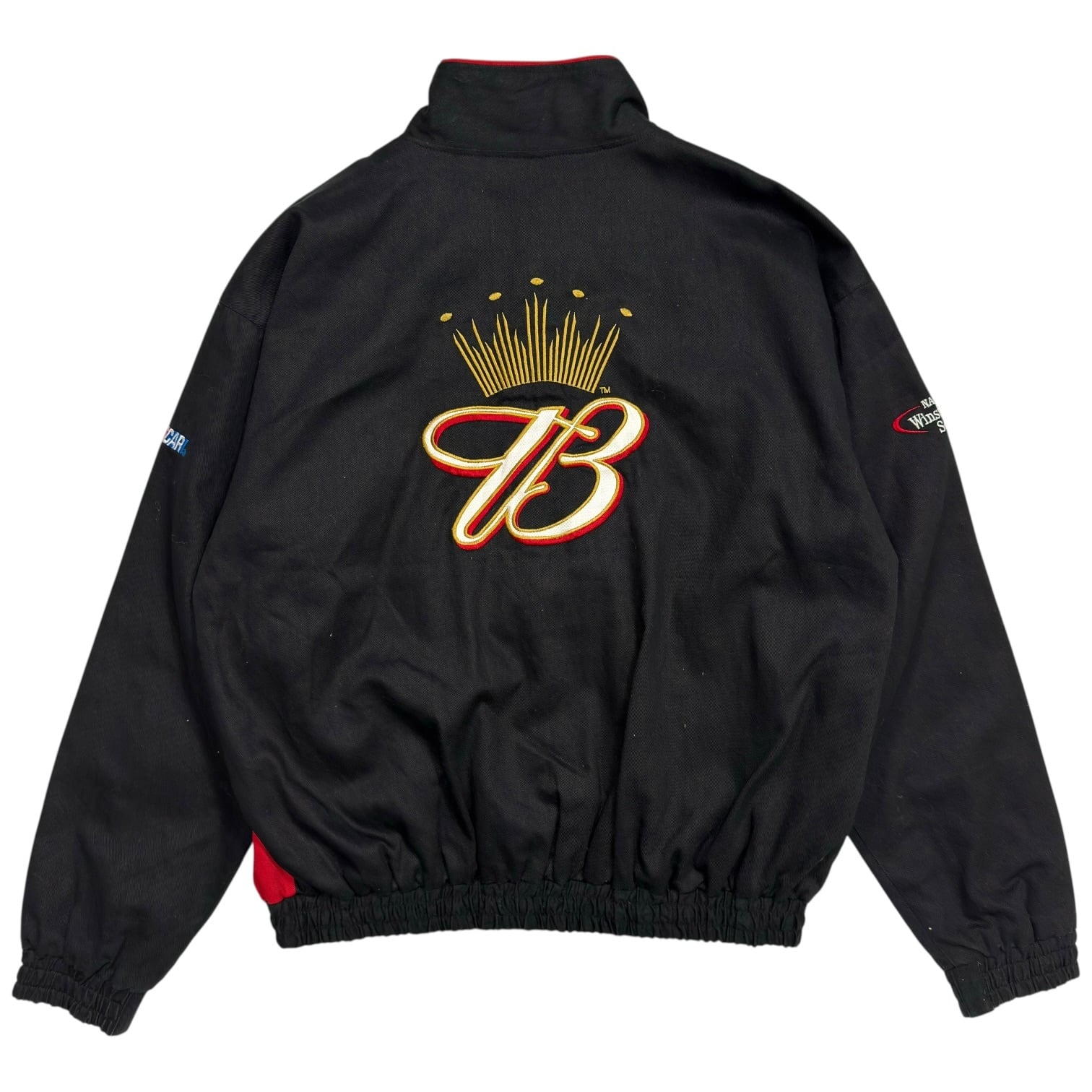存在感のあるサイン刺繍やバックの巨大なバドワイザーロゴ、両袖にもNASCARウィンストンカップなどのオフィシャル刺繍が施されており、非常に豪華なデザインです。