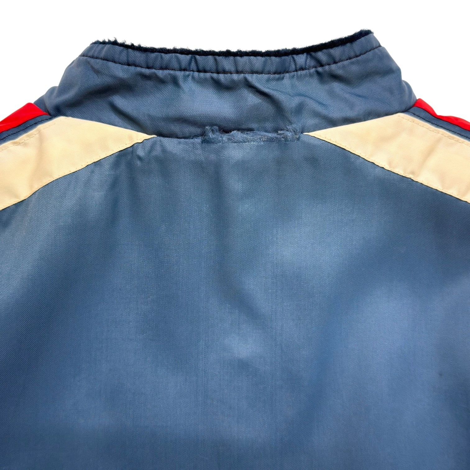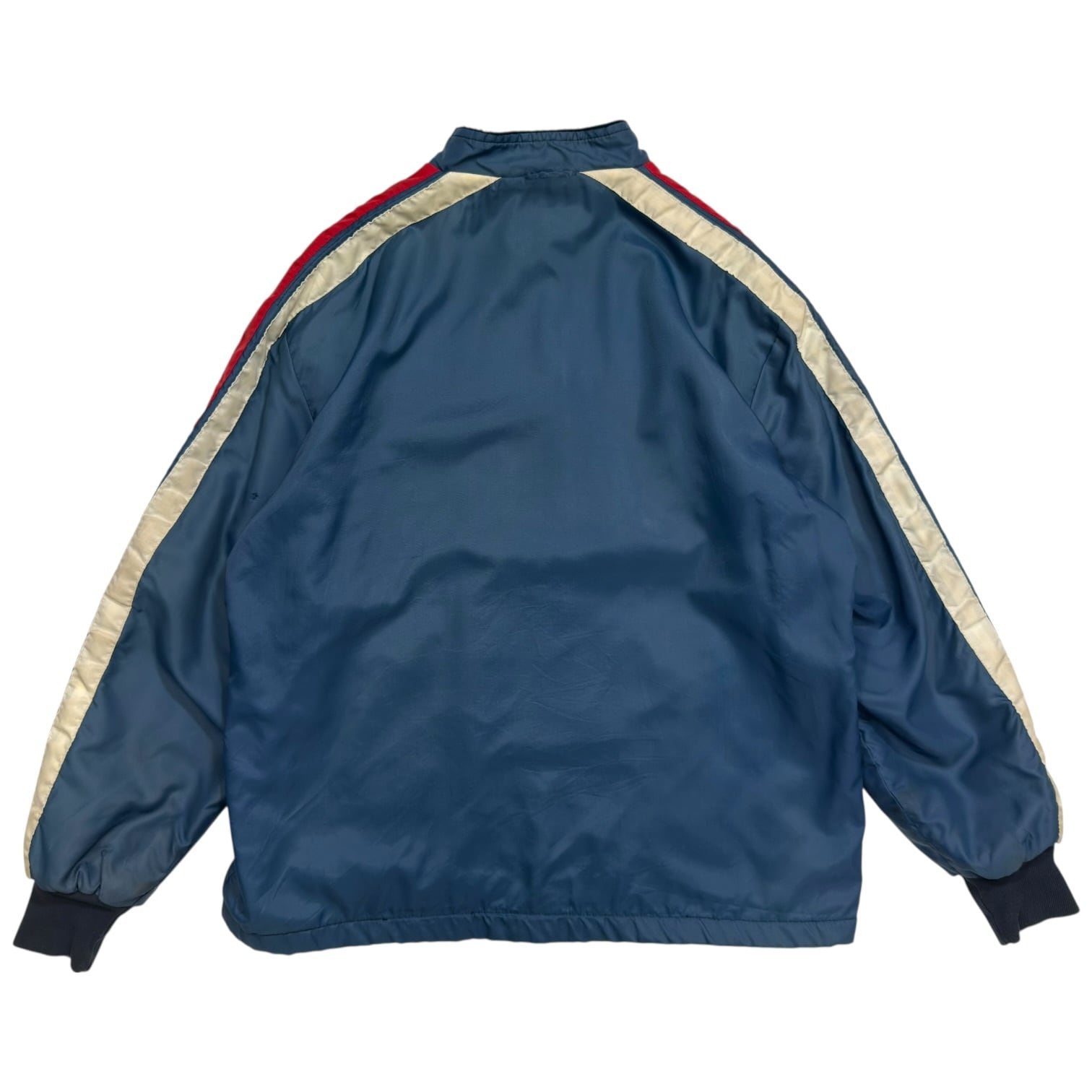 ブルーのボディに、フロントや袖に走るレッドとホワイトのレーシングストライプが、70-80年代当時のモーターカルチャーらしさを感じられる一枚。
