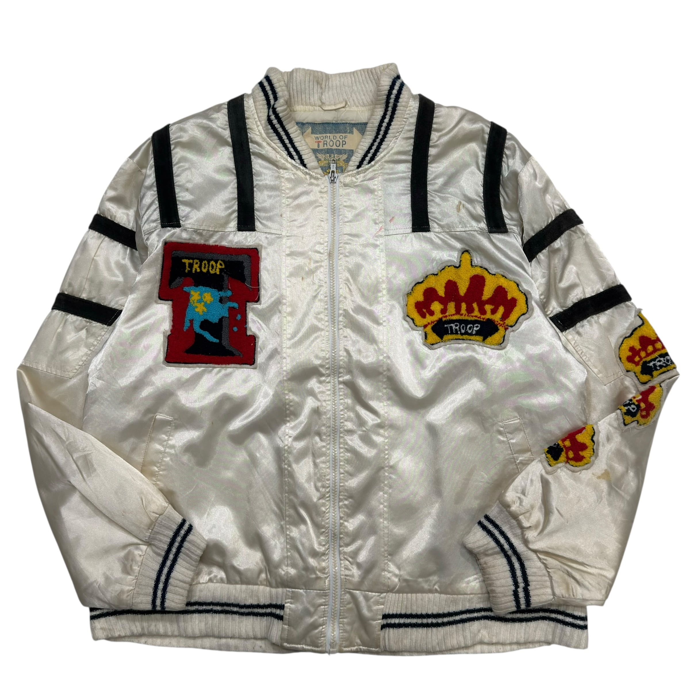 フロントには「T」ロゴと、Troopロゴ入りの王冠の巨大な刺繍ワッペン、袖にも王冠パッチがあり、バックには「Troop Original Design」「Troop Total Force」と特大のワッペンが施された豪華な仕様。