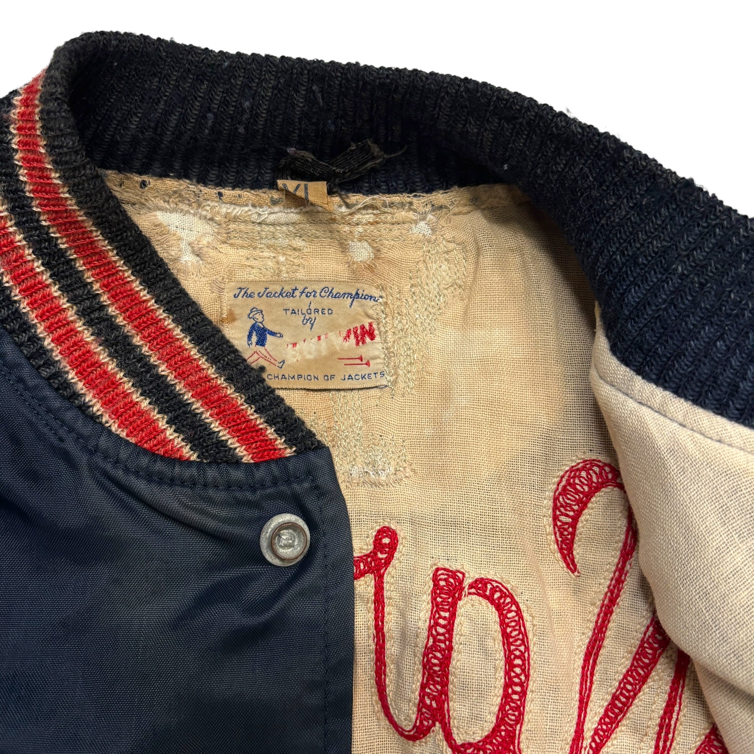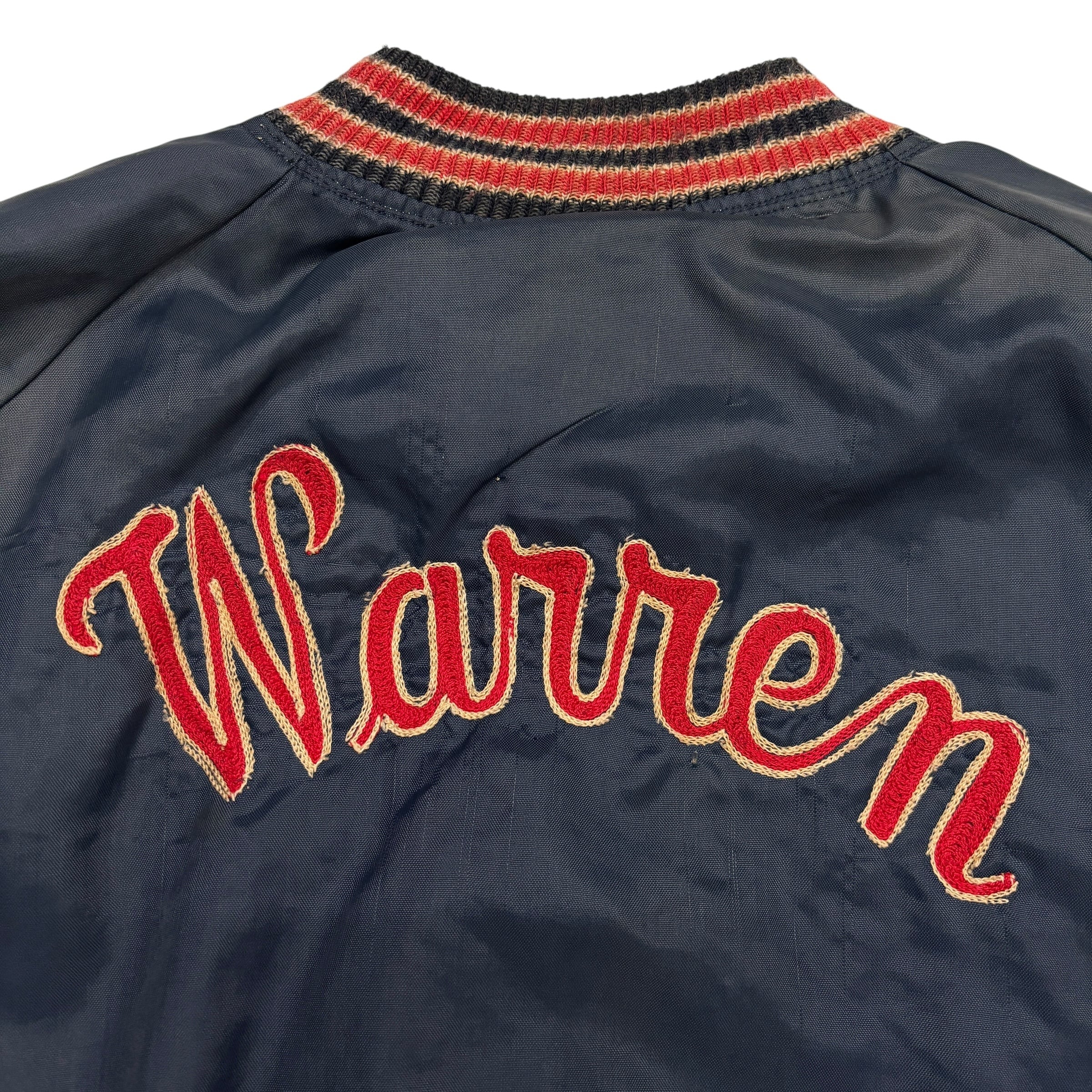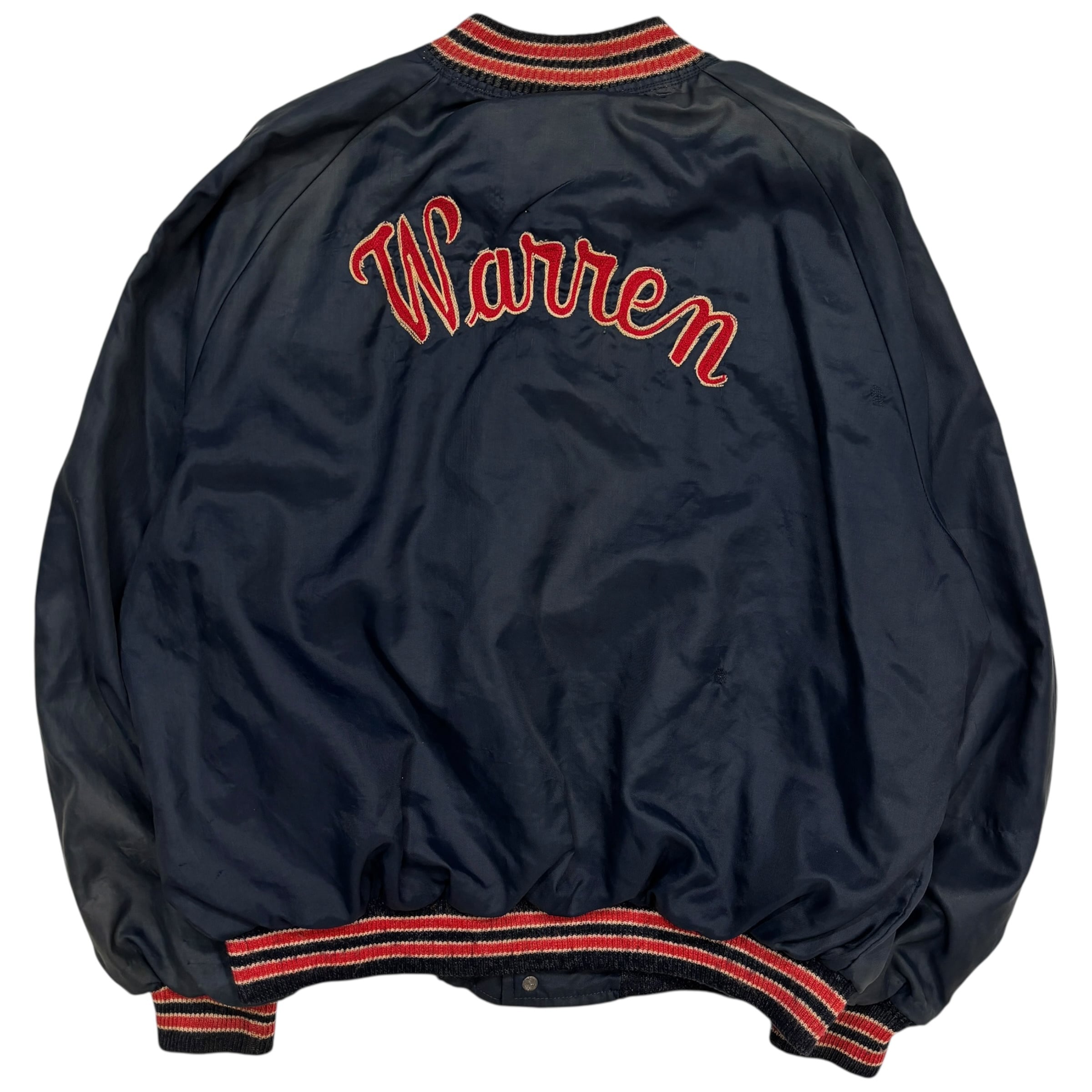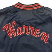 ネイビーのサテンボディに、赤×白のライン入りリブ、フロントは「Red Pump LOUNGE」のチェーン刺繍、バックには“Warren”のチェーン刺繍が入るヴィンテージのスタジャン。光の当たり方で表情が変わるサテン特有の艶と、立体感のある刺繍の組み合わせがとにかく良く、羽織るだけで雰囲気が出る1着です。