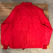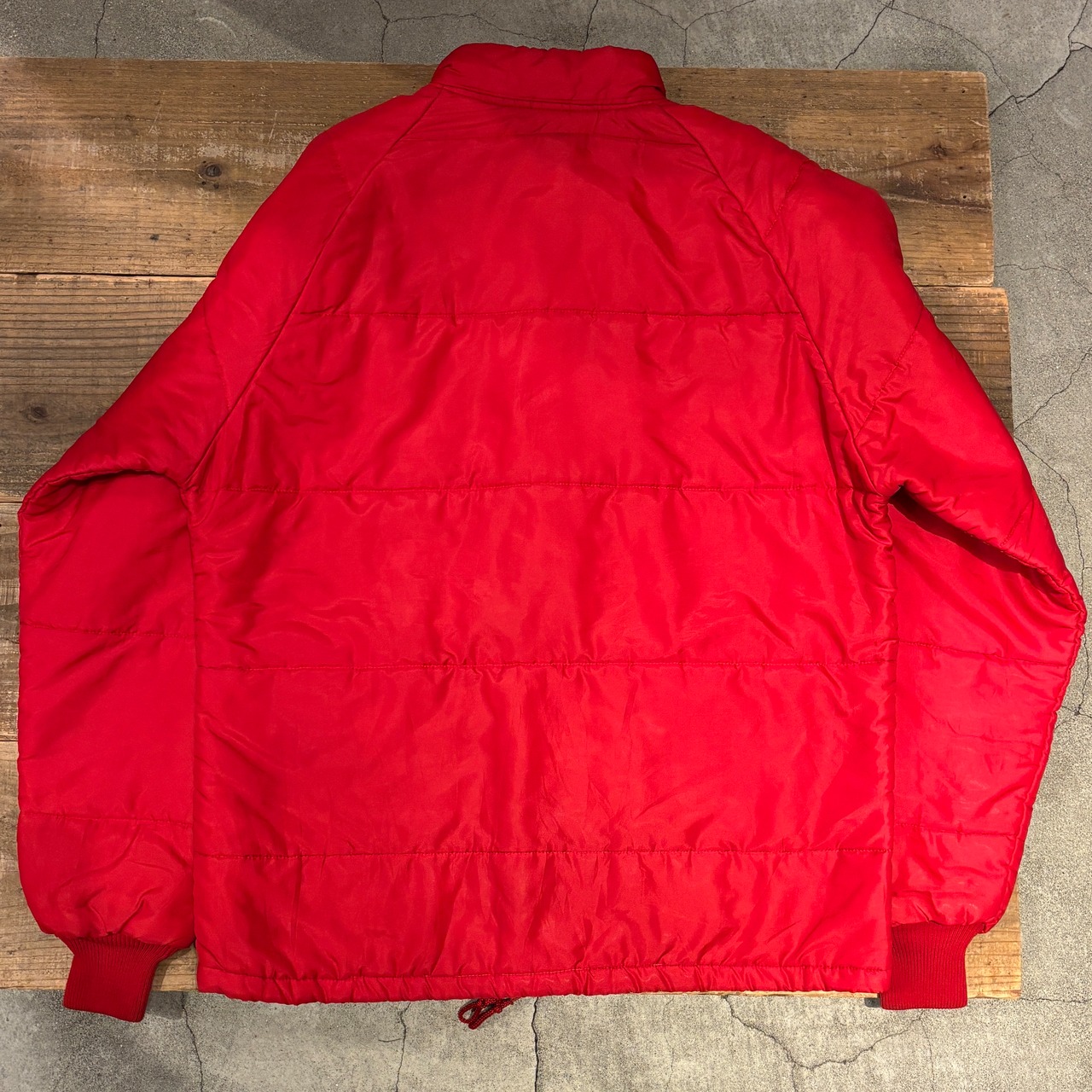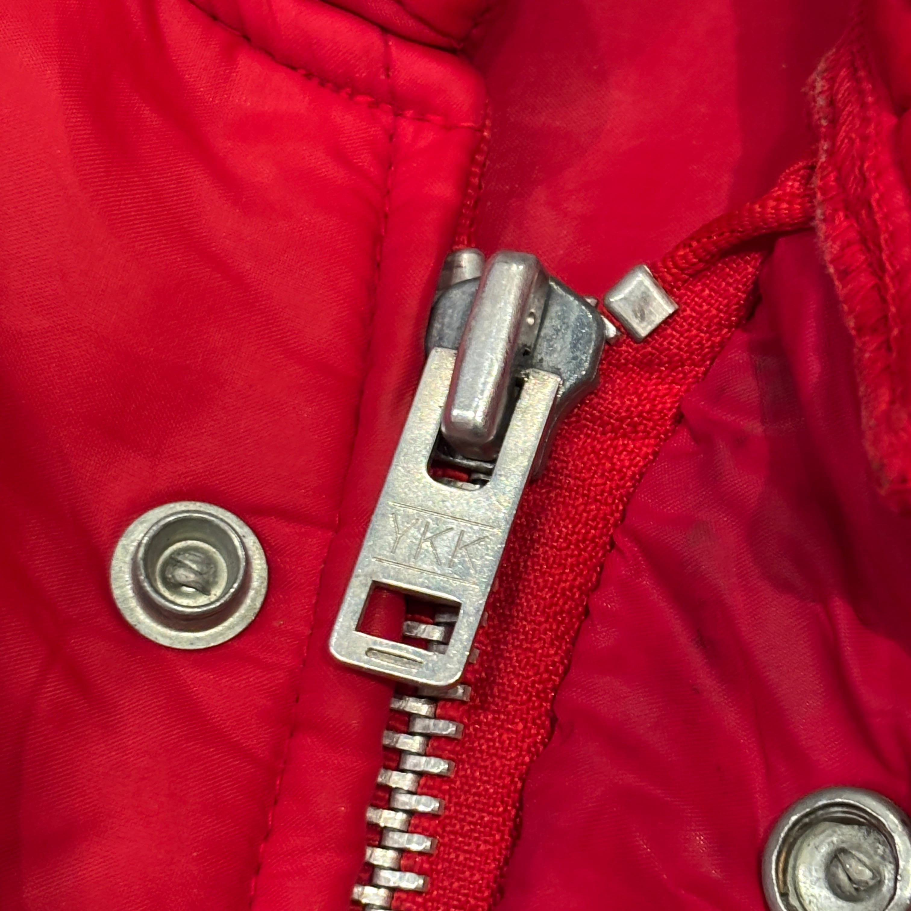 赤一色のボディに映えるシンプルなデザイン。スナップフロント、ハイネック、フラップ付きポケットを備えた実用的なつくりで、しっかりアウターとして使えるジャケット型。見た目だけでなく、普段使いしやすいバランスも魅力かと思います。
