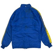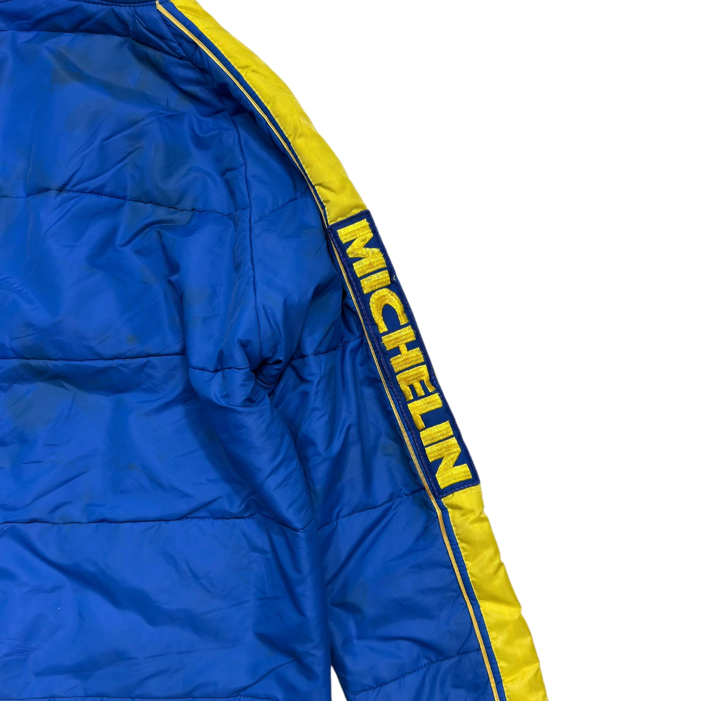 鮮やかなブルーボディに、ミシュランのコーポレートカラーであるイエローのレーシングストライプが映える、まさに王道のデザイン。左胸にはミシュランマンのワッペン。