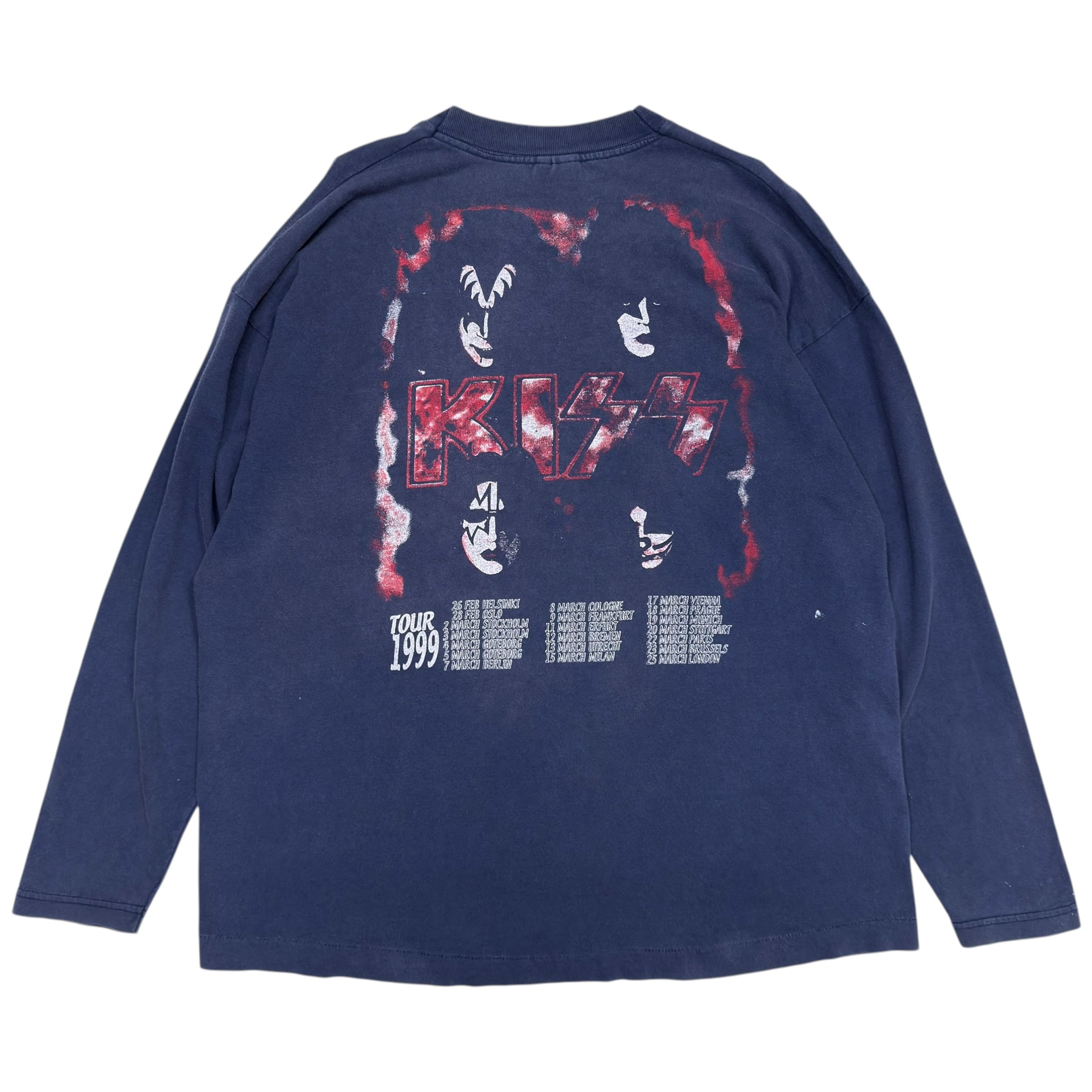 KISSの“Psycho Circus”期らしいインパクトのあるグラフィックが目を引く、1999年ツアーのロンT。フロントは大きく入るKISSロゴに加えて、サーカス感の強い毒気のあるアートワークがしっかり主張していて、バンドTらしい派手さとダークなムードが同居した1枚です。
