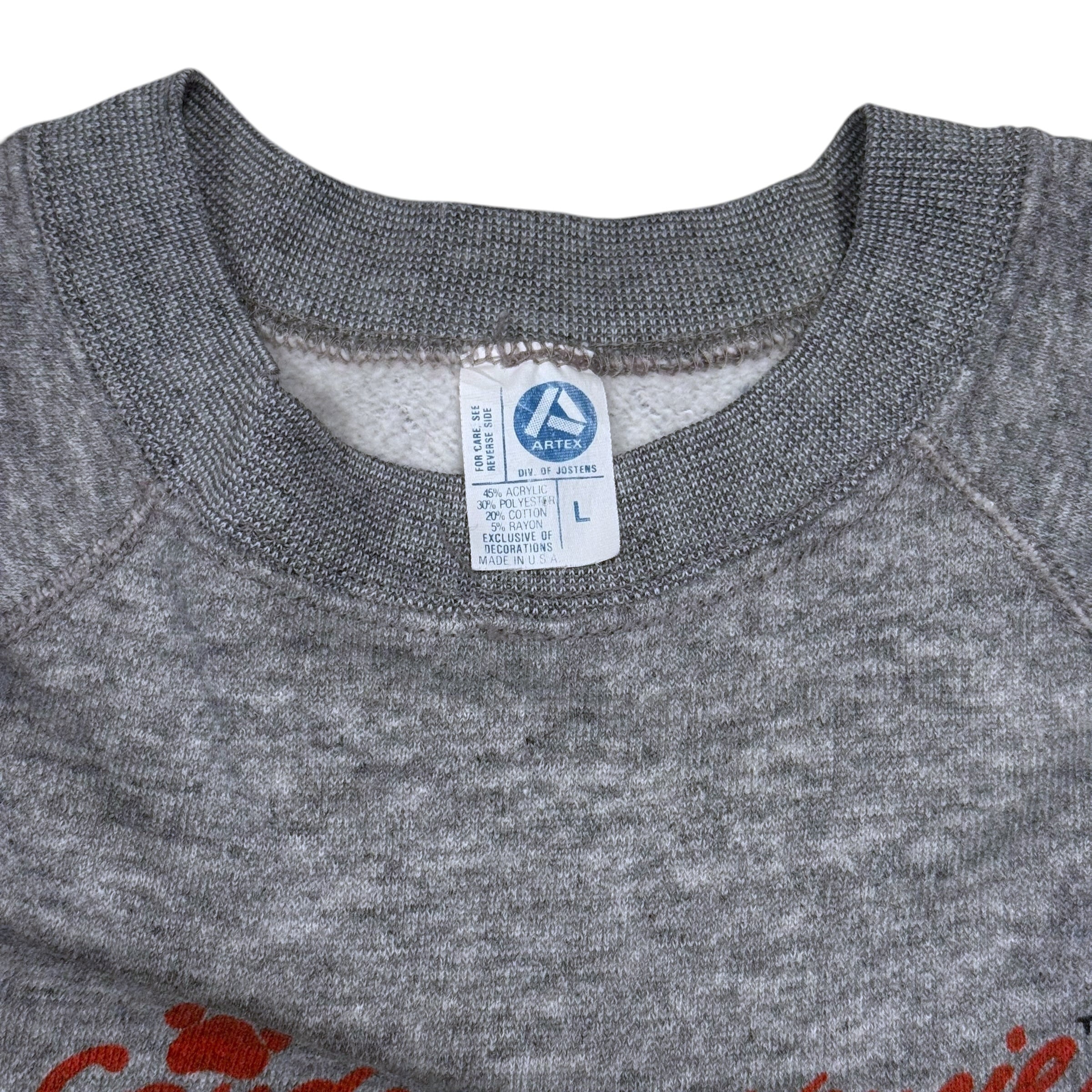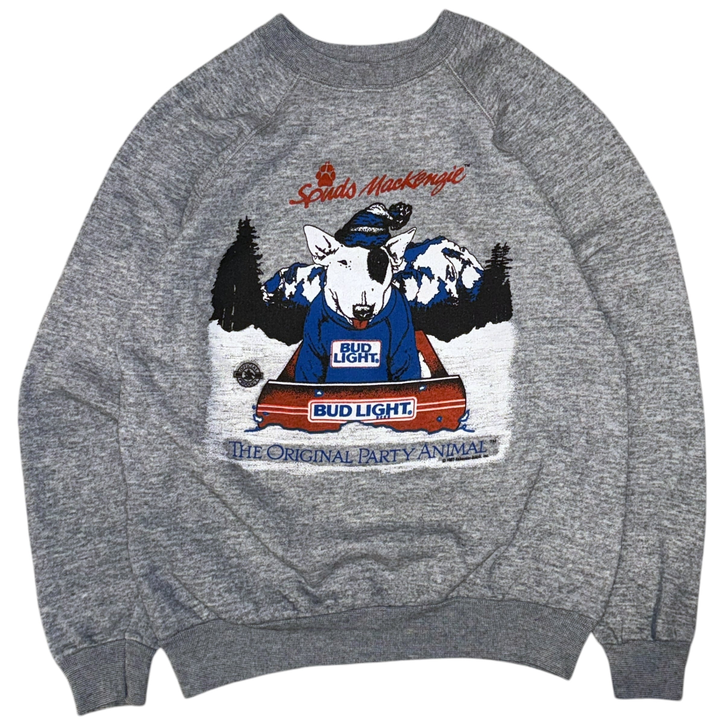 Bud Lightの広告キャラクターとして知られる“Spuds MacKenzie”が大きくプリントされたスウェット。アッシュグレーのボディに、雪山を背にソリへ乗ったブルテリアのグラフィックが入る、企業キャラクター物ならではのインパクトを楽しめる1着。