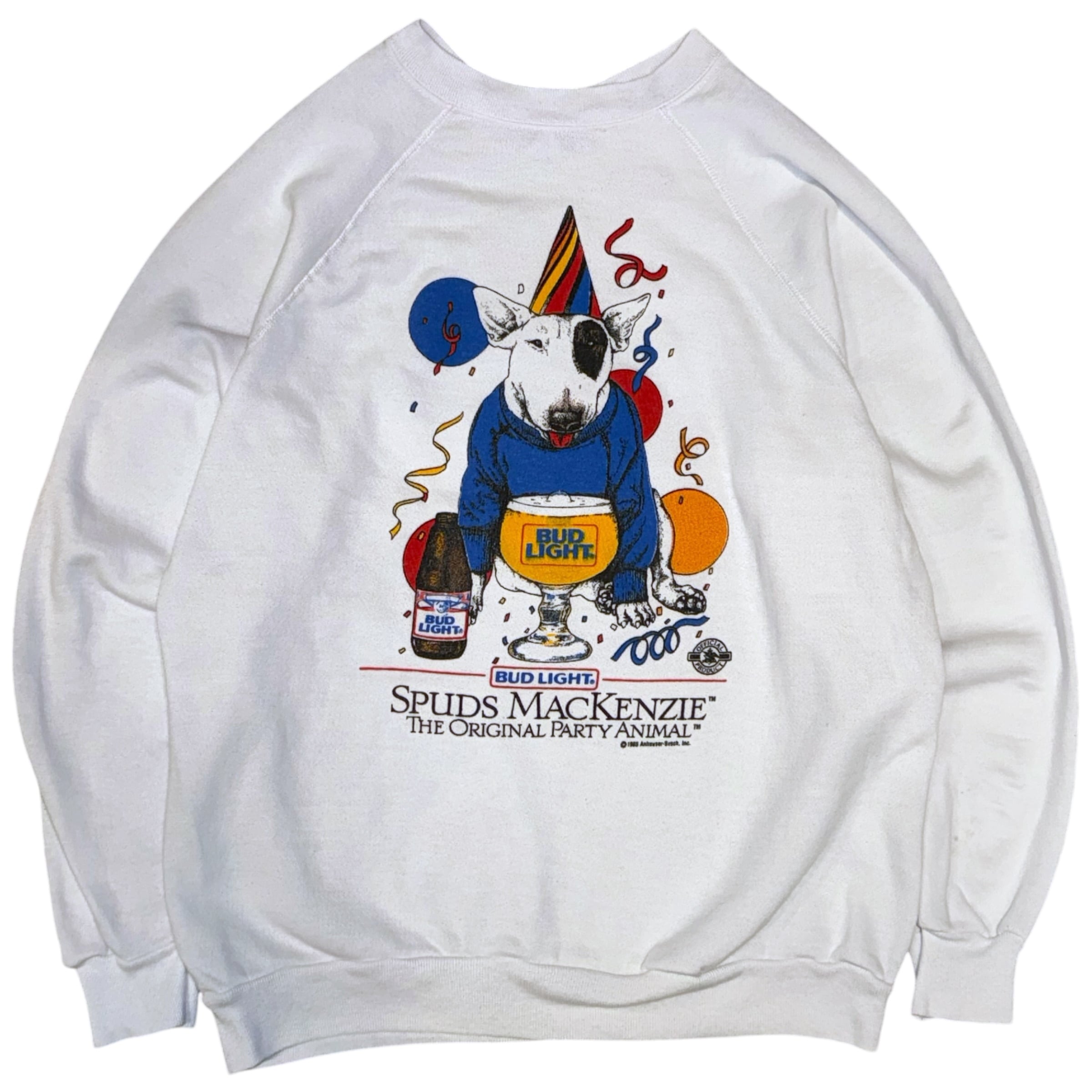 Bud Lightの広告キャラクターとして知られる“Spuds MacKenzie”が大きく入ったプリントスウェット。パーティーハットをかぶったブルテリアとBud Lightのグラス、ボトル、そして“THE ORIGINAL PARTY ANIMAL”のフレーズまでしっかり入る、企業広告物らしい遊びの効いたデザインが魅力の1着。