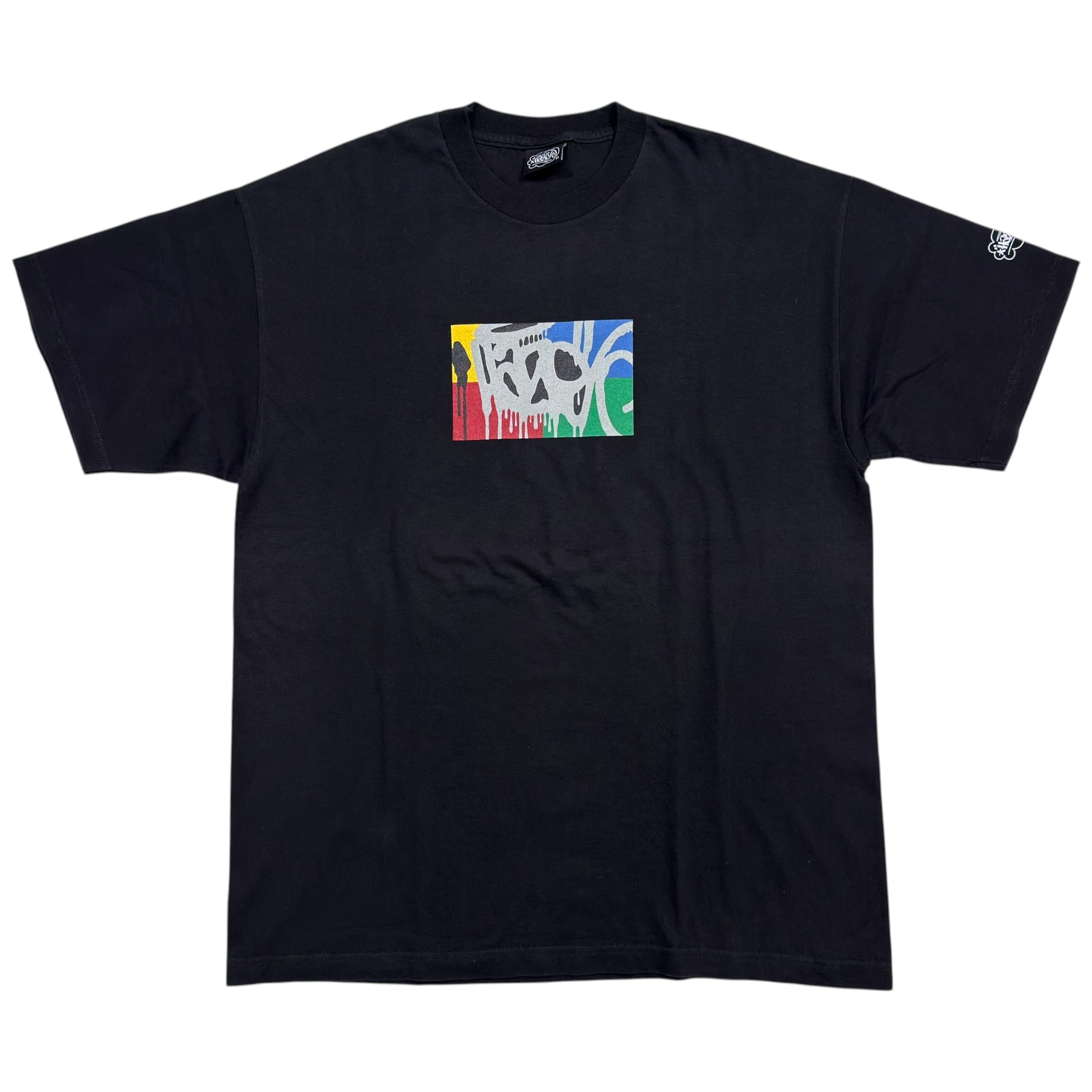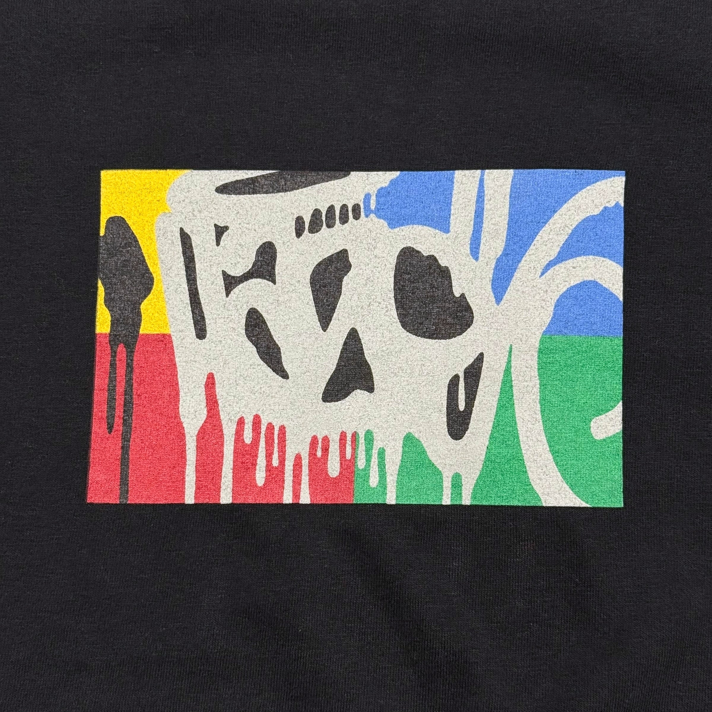 ブラックボディの上に、アート感のあるデザインがコンパクトに収まっていて、派手すぎないのにしっかり存在感のある1枚です。イエロー、レッド、ブルー、グリーンの色使いに、垂れるようなラインや崩したタッチが重なり、ストリート寄りの空気とグラフィックとしての完成度がうまく同居した内容になっています。