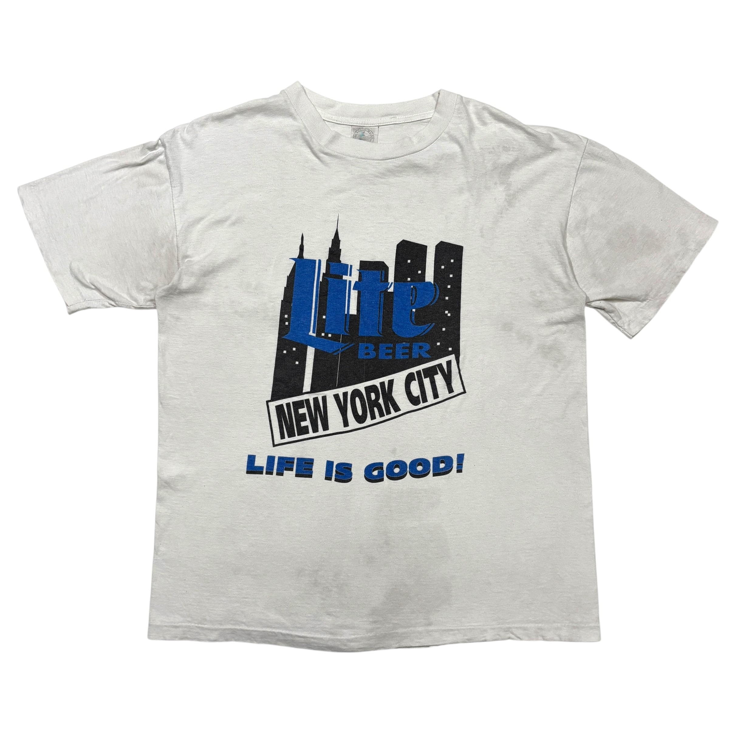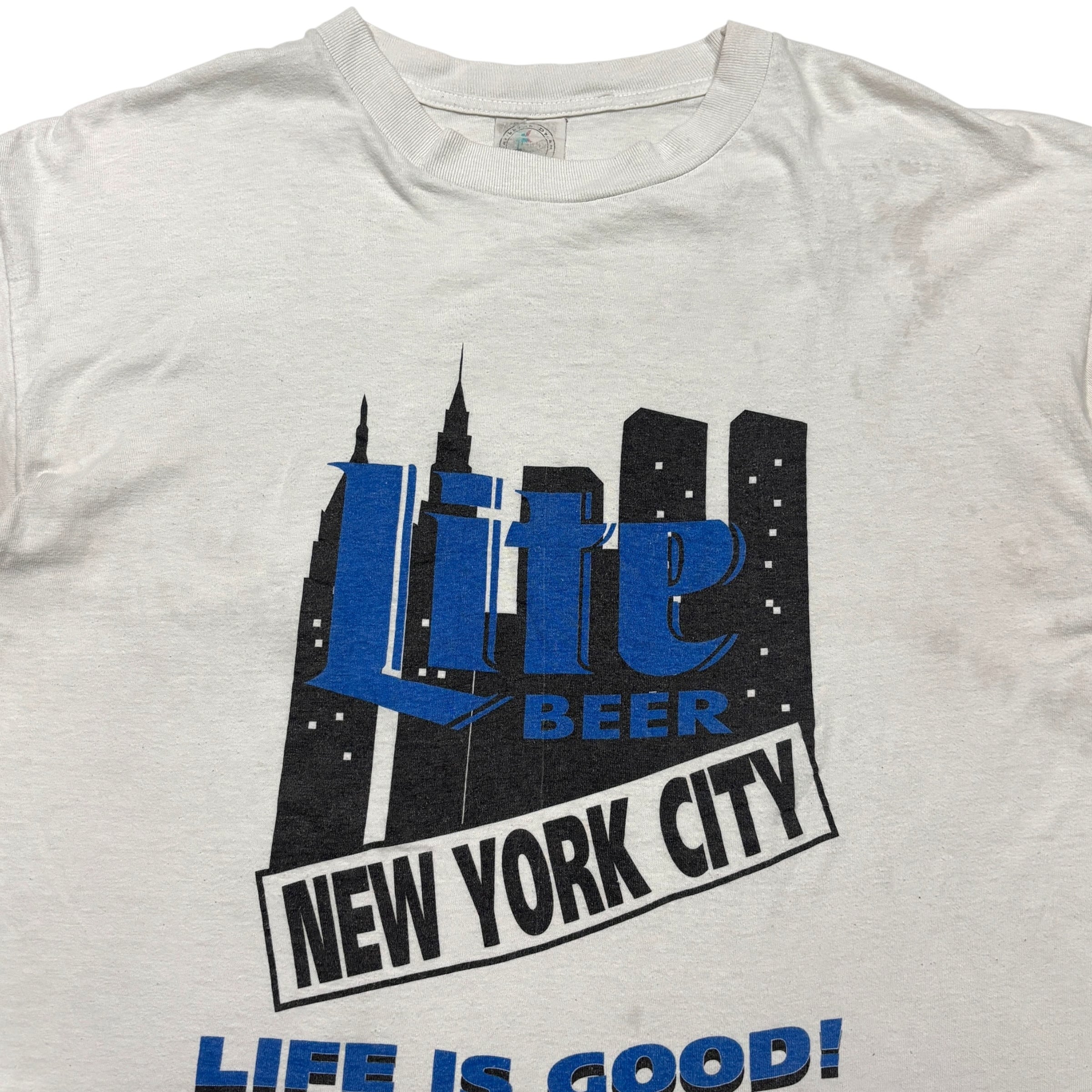 フロントはニューヨークのスカイラインを背景にしたグラフィックに、“Lite Beer”ロゴと“NEW YORK CITY”。都市モチーフとビールロゴをそのまま合わせた、アメリカっぽい直球のデザイン。