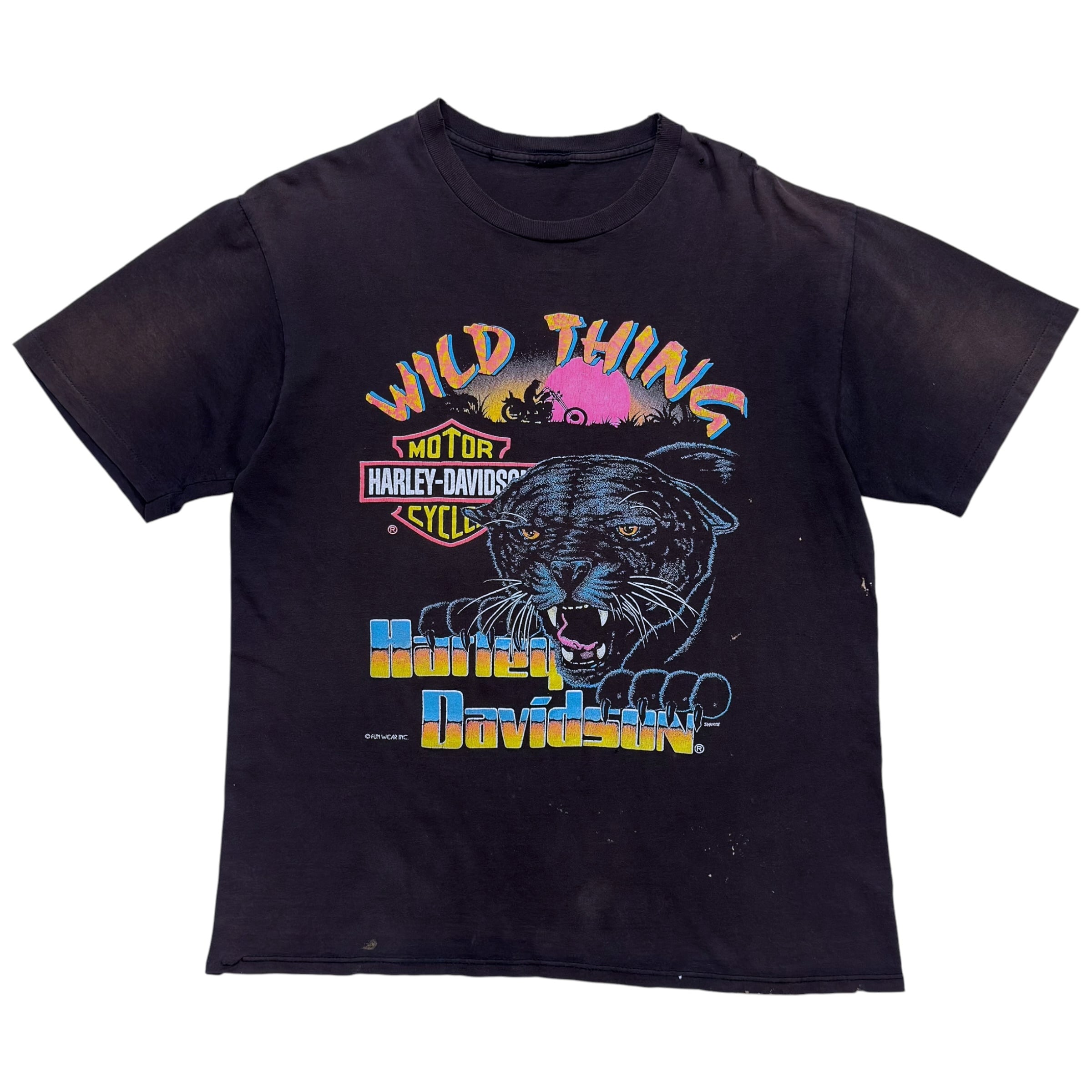 フロントは「WILD THING」のレターに、夕焼けを背に走るバイクとブラックパンサー。ピンクのサンセットにグラデーションのレター、この年代らしい配色が◎