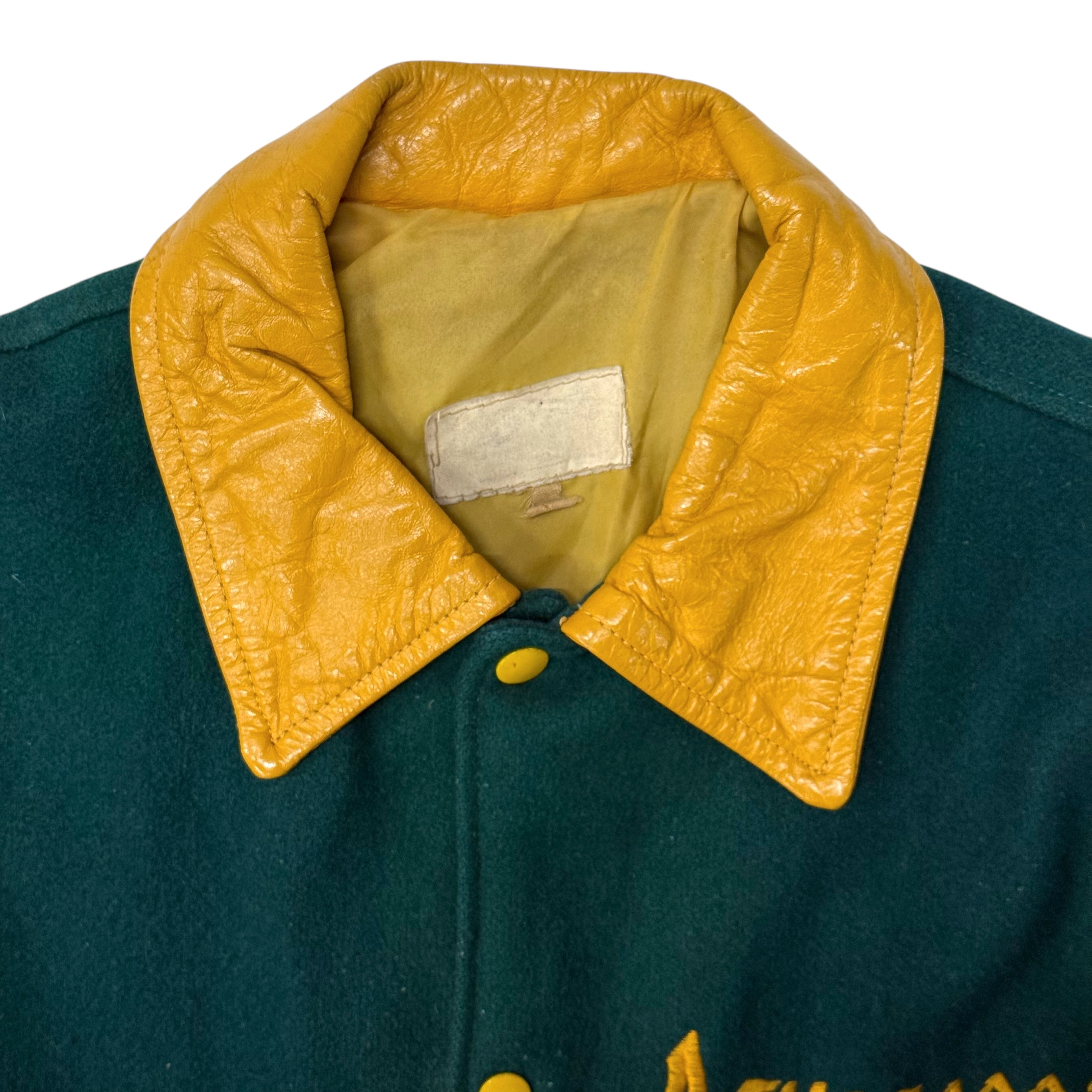 スタジャンとしては珍しい裾にリブが付いていないタイプのジャケット。レザーの切り返しになっており、