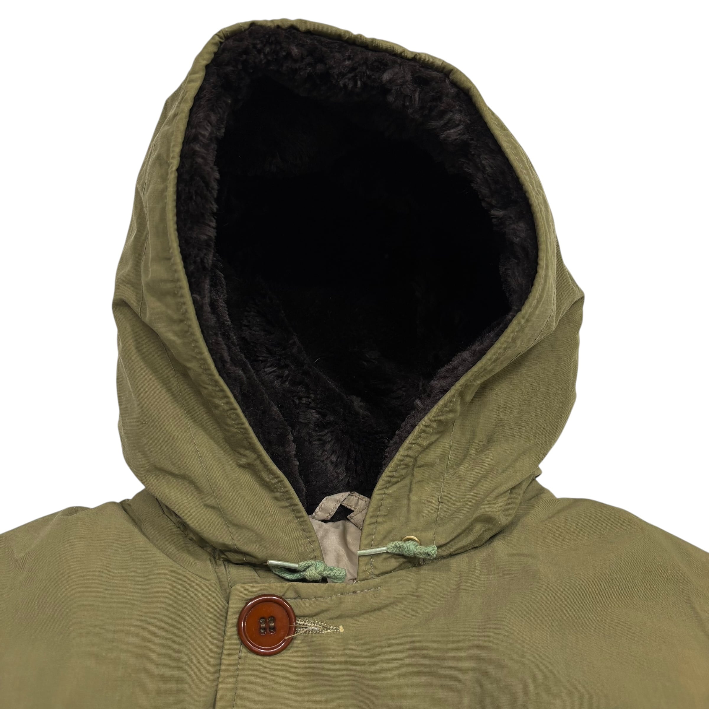 合わせ易いオリーブカラーのコットンナイロンシェルに、ムートンが張られたフードが一体型でB-9のようなルックス。